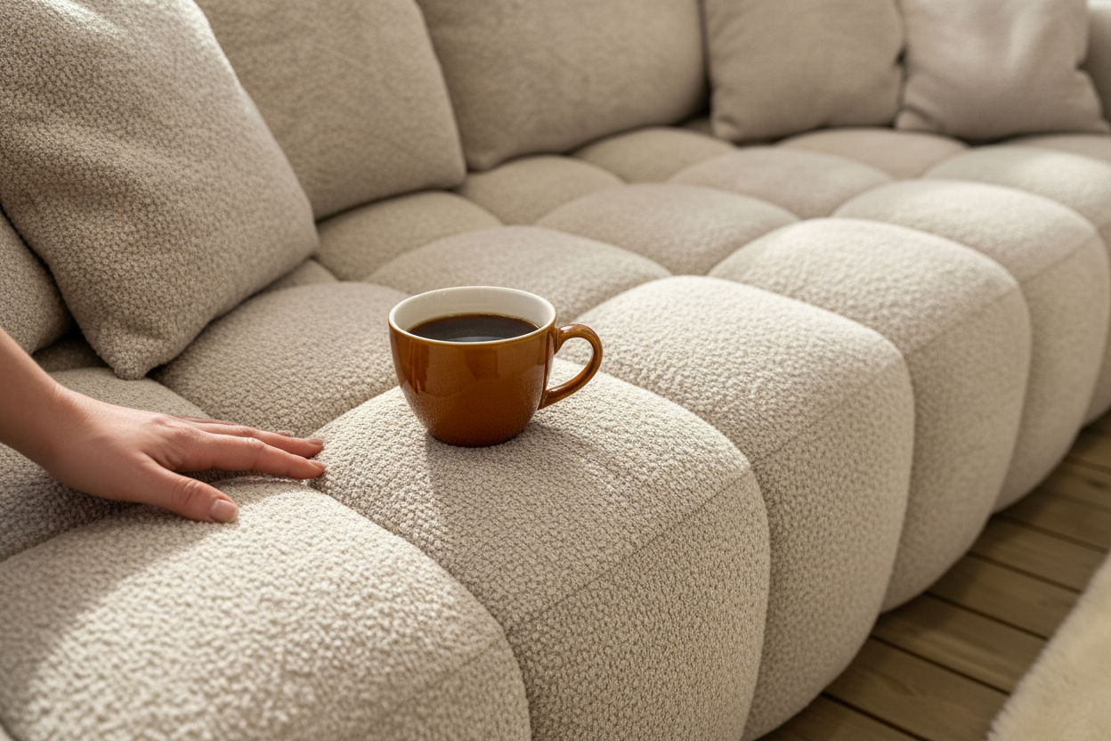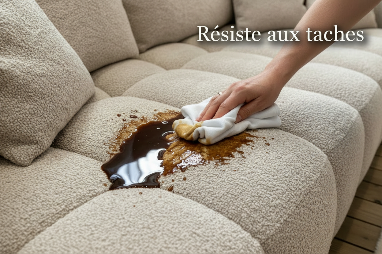 - Tissu bouclette anti-taches : esthétique chaleureuse et entretien facile