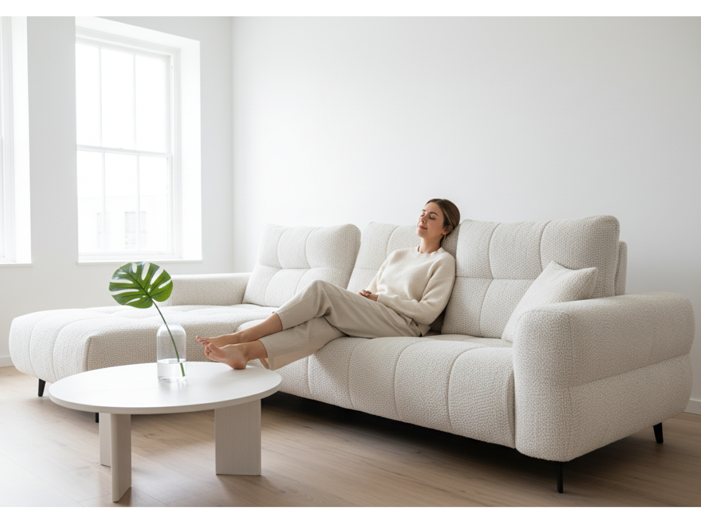 Le canapé d’angle bouclette Melania est pensé pour celles et ceux qui recherchent un canapé d’angle confortable, élégant et modulable. Grâce à son système avance-recule, il ajuste la profondeur d’assise selon vos envies, offrant une expérience de détente sur mesure, du moment lecture au véritable cocooning.