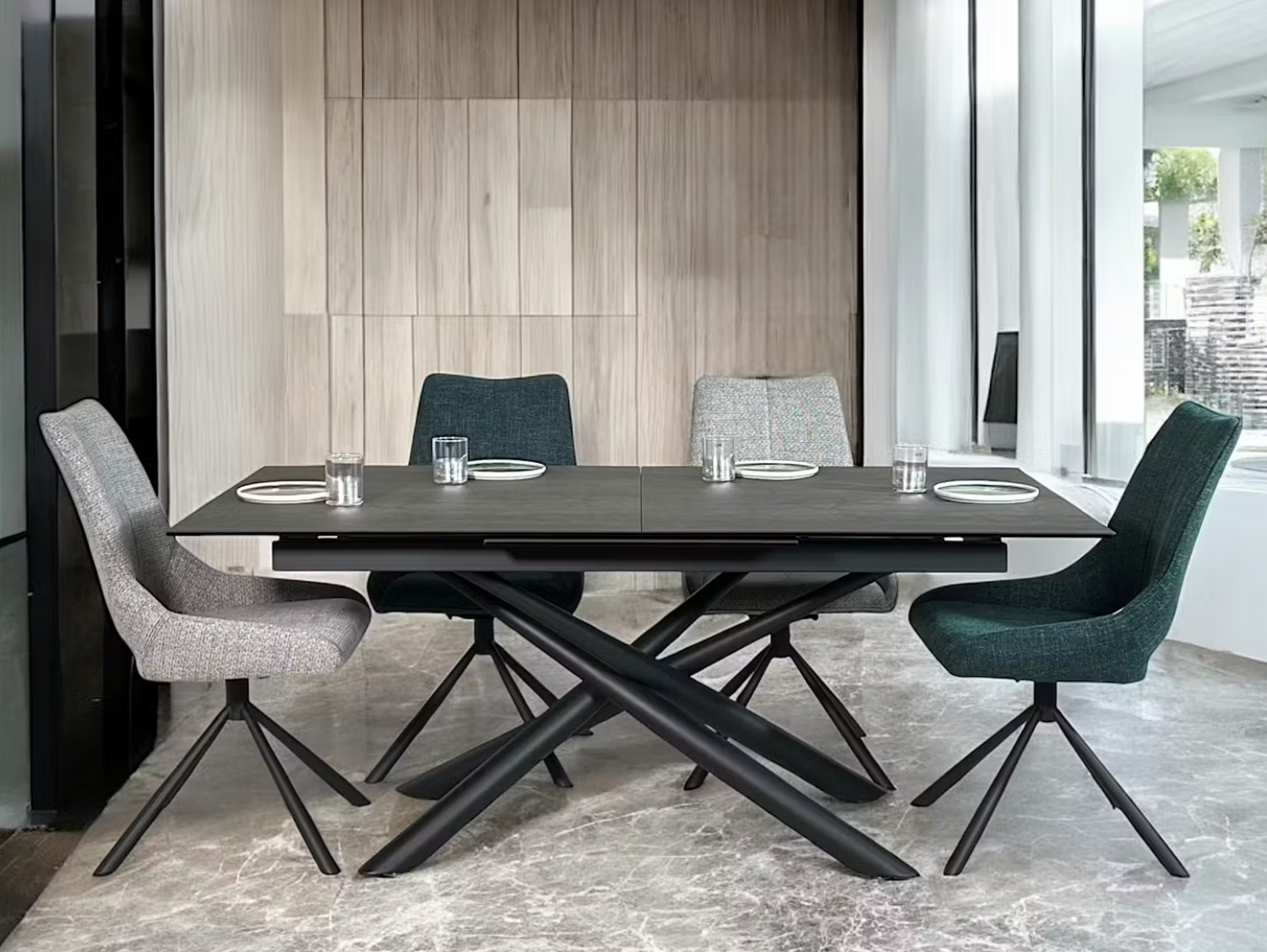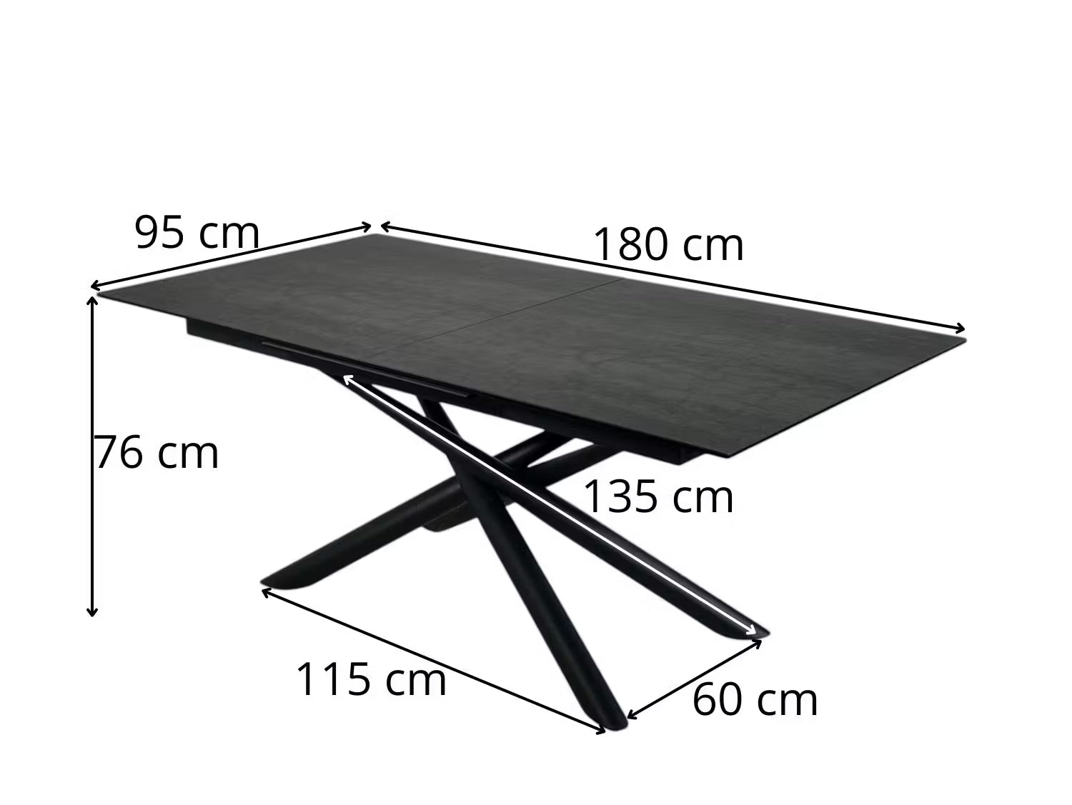The matt black crossed metal legs , both sturdy and elegant, provide perfect stability and a modern architectural style . Their matt finish subtly contrasts with the dark grey ceramic top , creating a table with a strong charisma and a balanced design .