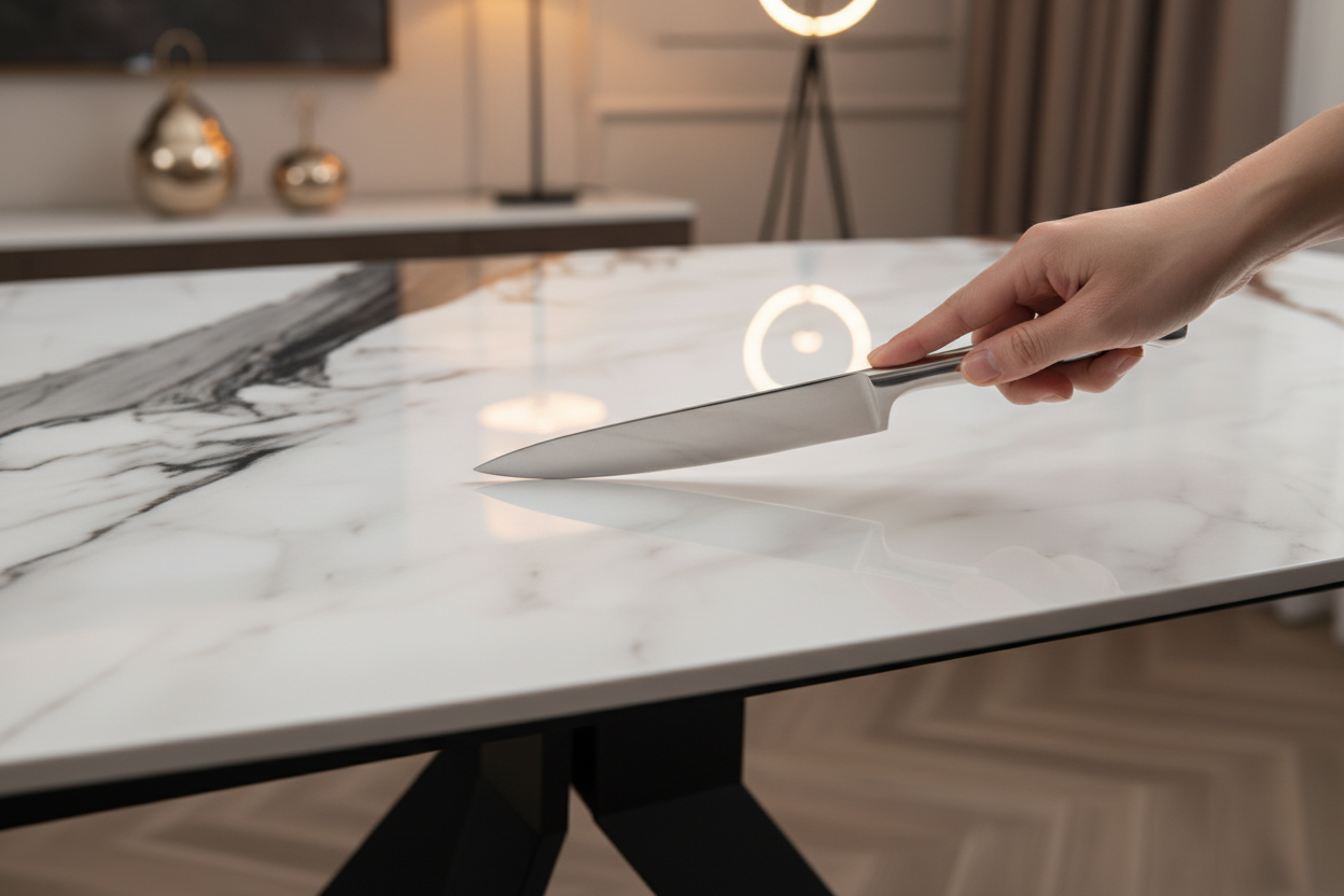 The 3 mm light grey ceramic top , glued to 8 mm tempered glass , combines modern aesthetics and resistance . Its white-brown marble effect brings a touch of warmth and refinement to your interior while being particularly resistant to scratches and wear. Thanks to its extendable mechanism , the Milaz table can go from 130 cm to 190 cm when open, offering you ideal flexibility to adapt to your everyday needs or to receive your guests with ease.