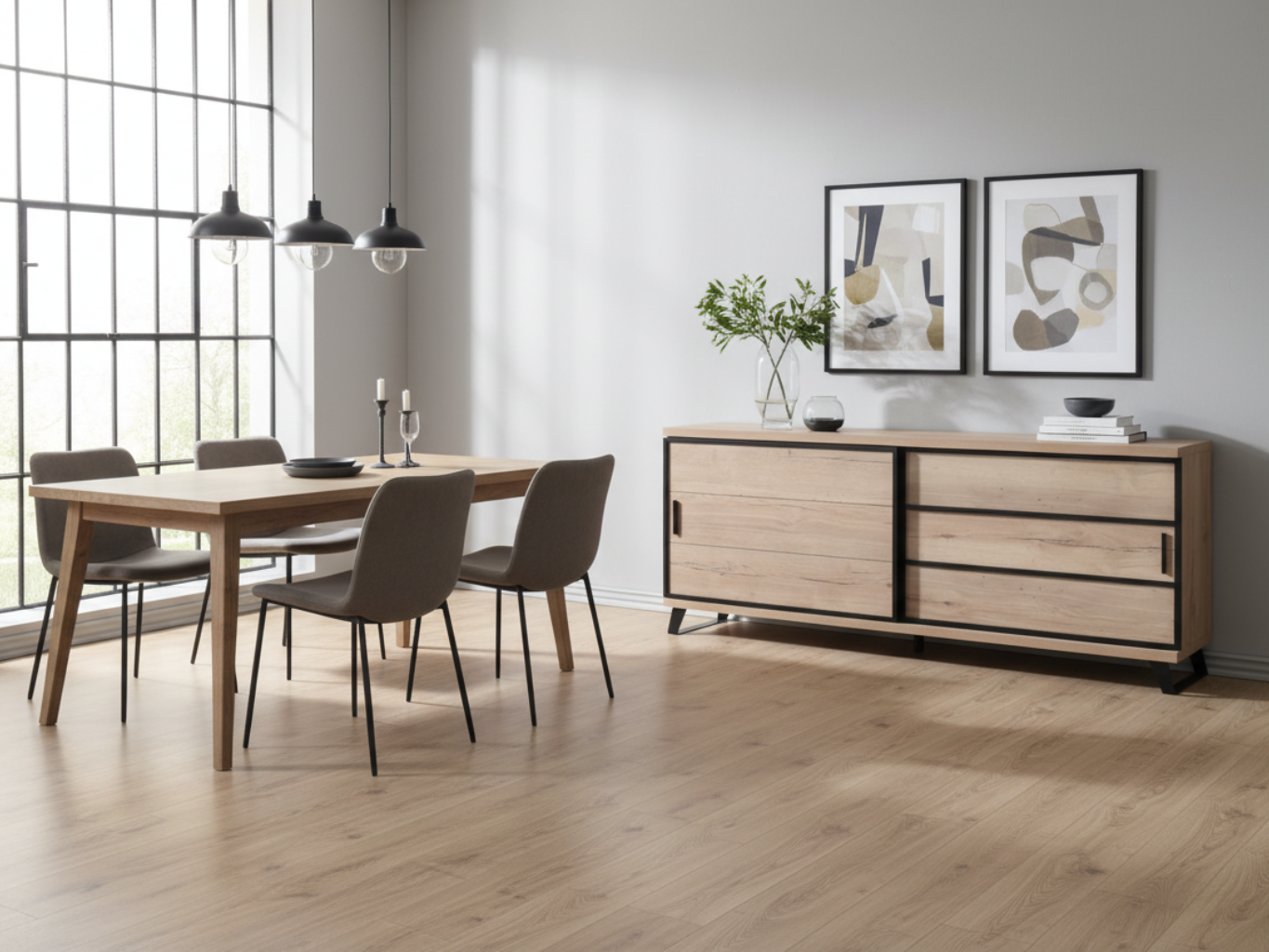 Le buffet bois naturel Rosa incarne l’équilibre parfait entre chaleur du bois et lignes contemporaines. Son veinage Halifax naturel, associé à des pieds en métal noir mat, apporte immédiatement caractère et élégance à votre salle à manger.