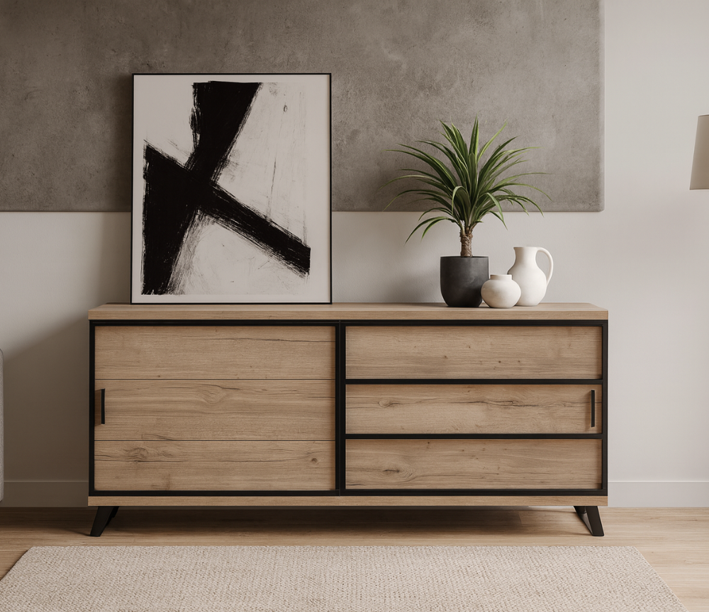 Le buffet Rosa apporte immédiatement une atmosphère chaleureuse et raffinée à votre salle à manger. Sa structure en bois naturel Halifax associée à des pieds en métal noir mat offre un équilibre parfait entre caractère et élégance contemporaine.