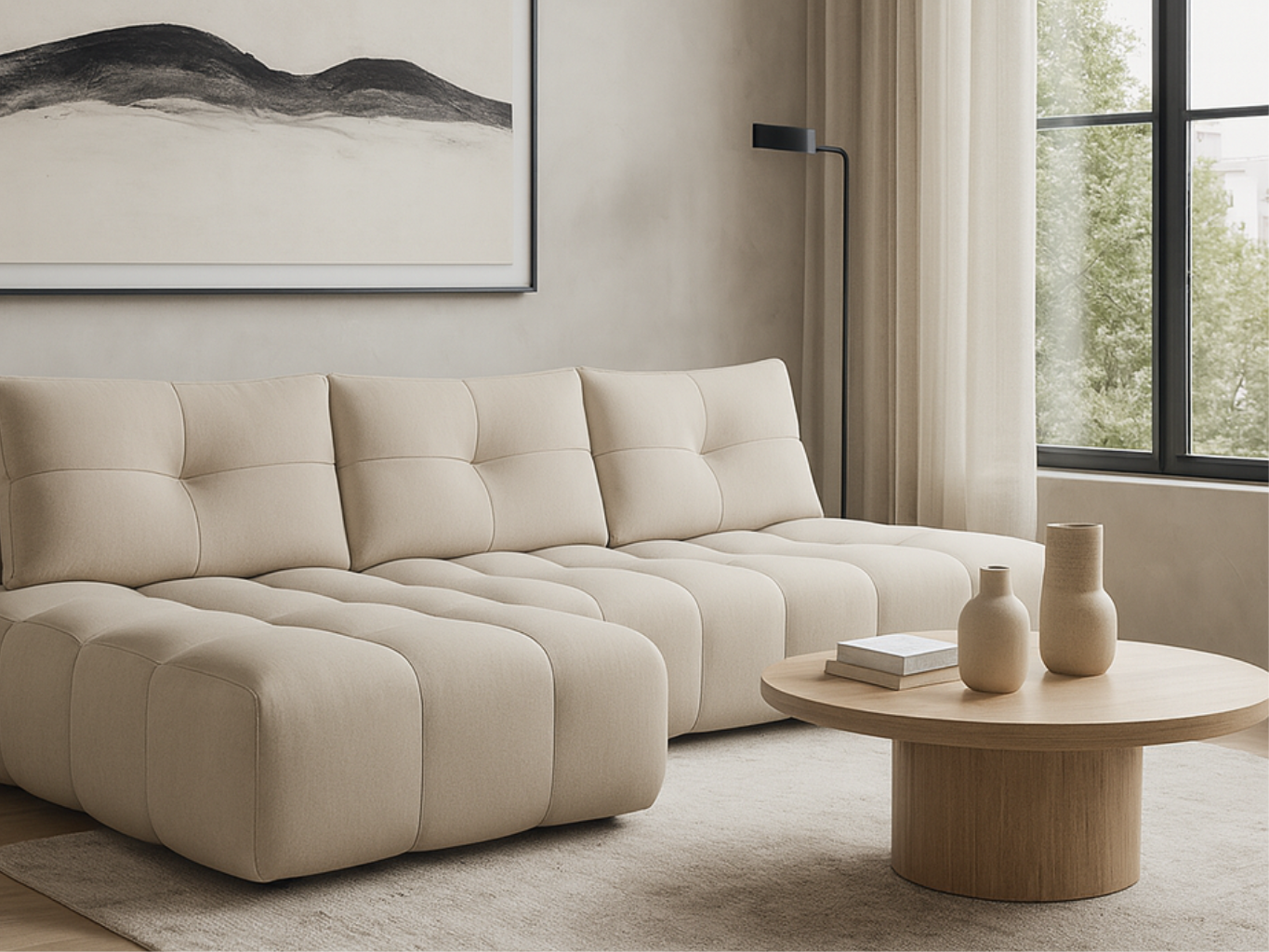 Le canapé d’angle modulable Cassia réinvente l’art de vivre au salon. Grâce à ses dossiers coulissants, ajustez en un geste la profondeur de votre assise (129 à 137 cm) et profitez d’un confort sur mesure, selon vos envies du moment : lecture, détente ou convivialité.