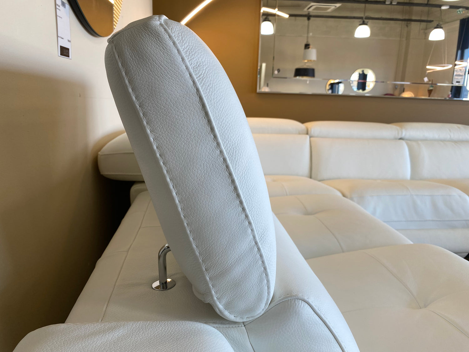 Ce canapé d’angle panoramique en cuir blanc intègre deux relax électriques avec mécanisme dos au mur : un confort total sans perte d’espace. Chaque appuie-tête est relevable manuellement sur crémaillère pour s’adapter à votre position : lecture, détente ou télévision. Une invitation permanente au bien-être.