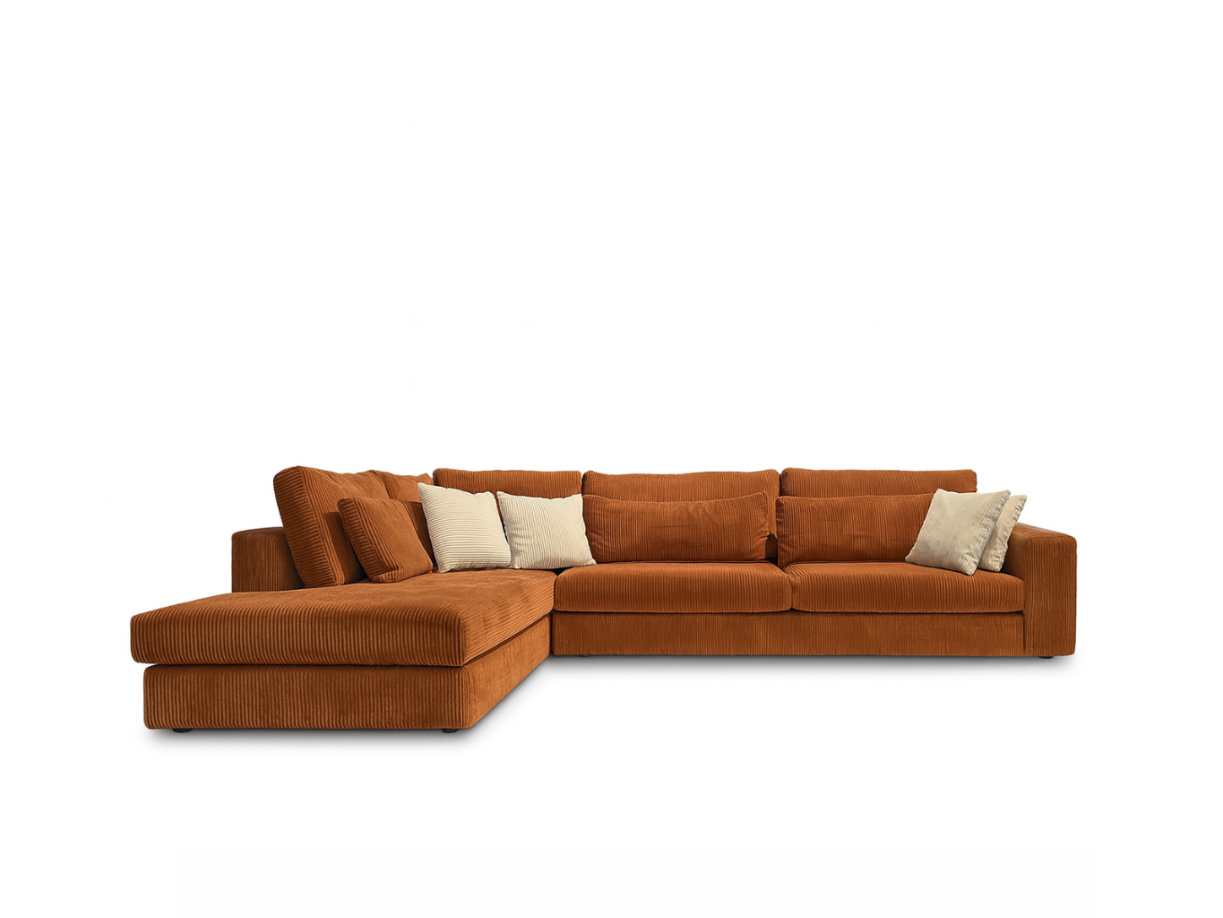 Avec ses dimensions généreuses (288 x 246 cm) et sa profondeur confortable de 109 cm, Riny s’adapte parfaitement aux grands espaces comme aux lofts urbains. Son angle modulable, disponible à droite ou à gauche, optimise votre aménagement en délimitant un coin détente cosy, sans sacrifier le style.