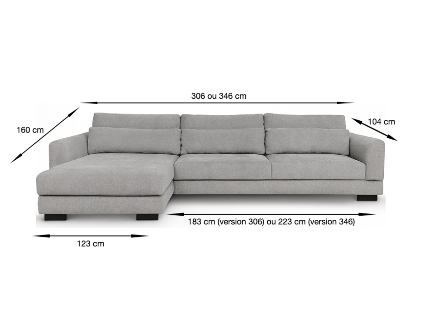 Romane existe en 306 cm ou 346 cm de longueur. Il mesure 104 cm de profondeur, 85 cm de hauteur, et la méridienne mesure 160 cm.