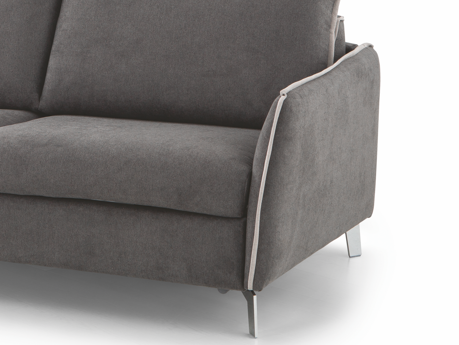 - Design élégant : tissu gris, passepoil anthracite, pieds chromés.