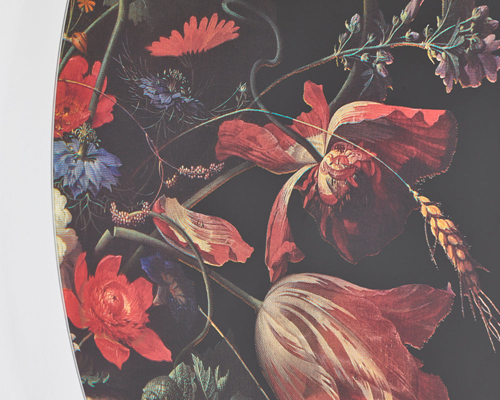 Le miroir Museo est bien plus qu’un miroir : c’est une œuvre d’art murale. Ce grand miroir rond de 100 cm de diamètre reprend un fragment d’une nature morte du XVIIe siècle, signée Abraham Mignon. Tulipes, iris et feuillages se détachent sur un fond sombre qui se fond dans la surface miroir, créant un décor de fleur de lys romantique aussi délicat que spectaculaire.