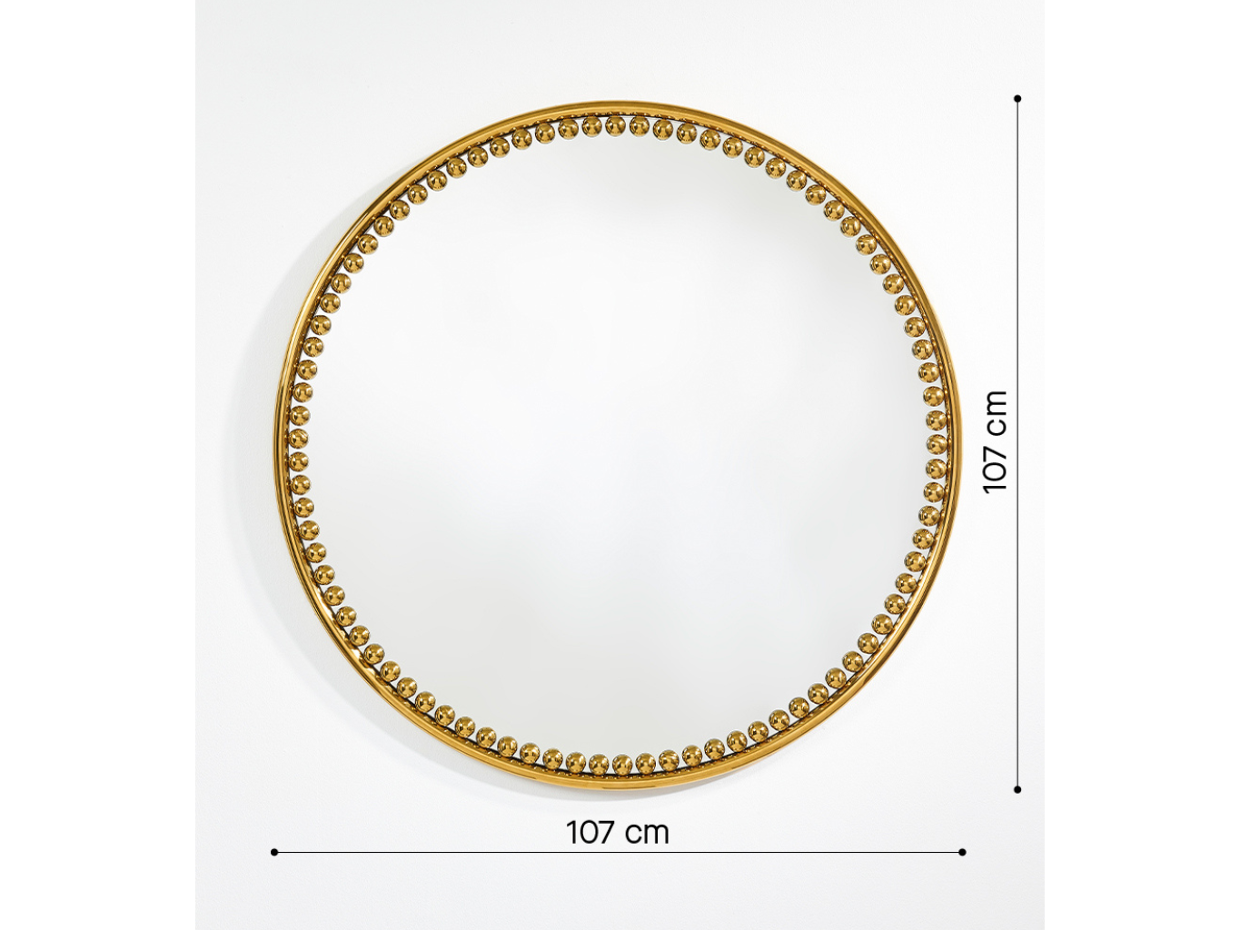 Le miroir doré rond Diva possède un diamètre de 107 cm, pour une épaisseur de 3 cm et un poids d’environ 17 kg. C’est un grand miroir mural, idéal pour habiller un mur de salon ou d’entrée.