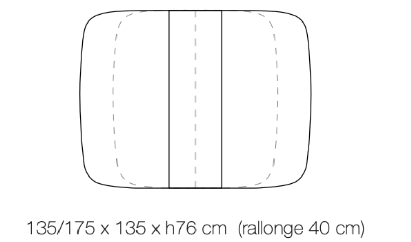 La table mesure 135 x 135 cm au format carré, et atteint 175 cm une fois ouverte avec ses rallonges.