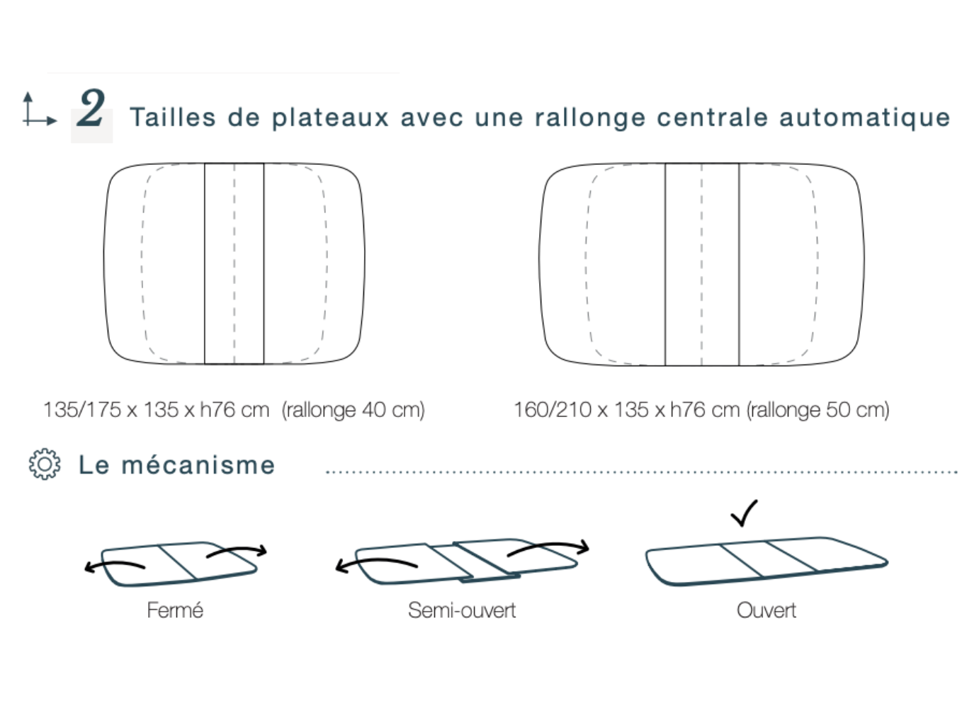 - Avec rallonges : jusqu’à 175 cm ouverte