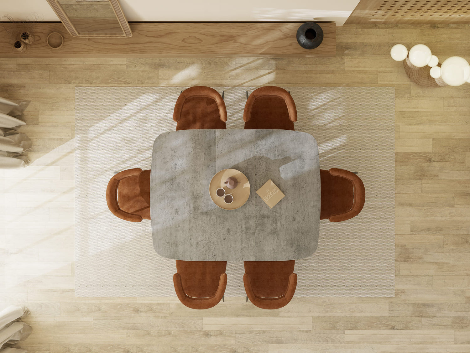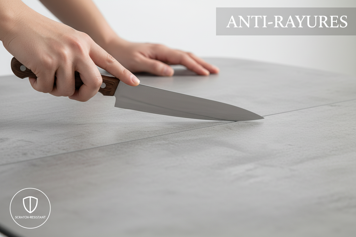 Le plateau associe une céramique de 3 mm collée sur un verre trempé de 8 mm. Résultat : une surface hautement résistante (chaleur, rayures, taches) et un entretien simple, parfait pour une table utilisée au quotidien.