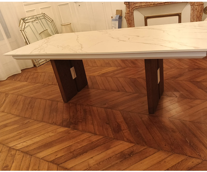 La table Marquis passe de 200 cm à 300 cm grâce à ses deux rallonges en bout de table. Elle peut accueillir jusqu'à 14 convives tout en gardant stabilité et harmonie visuelle. Idéale pour les grands repas en famille ou entre amis.