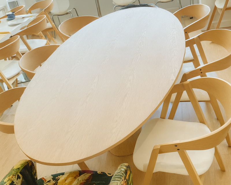 Ajoutez une touche de raffinement naturel à votre salle à manger avec la table Tulipe. Son plateau ovale et son piètement central en placage chêne clair créent une silhouette élégante et aérienne, idéale pour des repas chaleureux en famille ou entre amis.